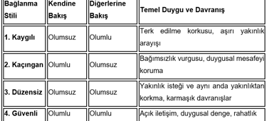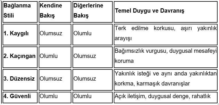 Bağlanma stilleri, temelde kişinin kendine bakış açısı (sevgiye değer miyim?) ve diğerlerine bakış açısı (başkaları güvenilir mi?) ekseninde şekillenir. Dört ana stil şunlardır: